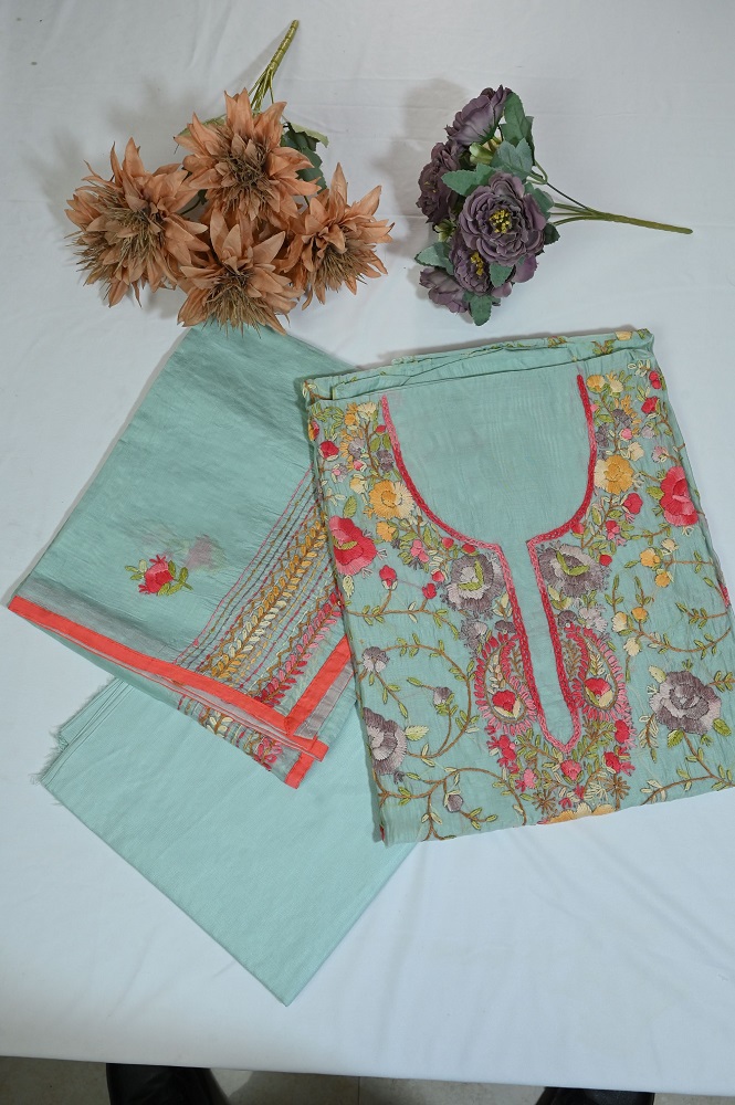 Hand embroidered chanderi cotton suit with embroidered dupatta and plane bottom